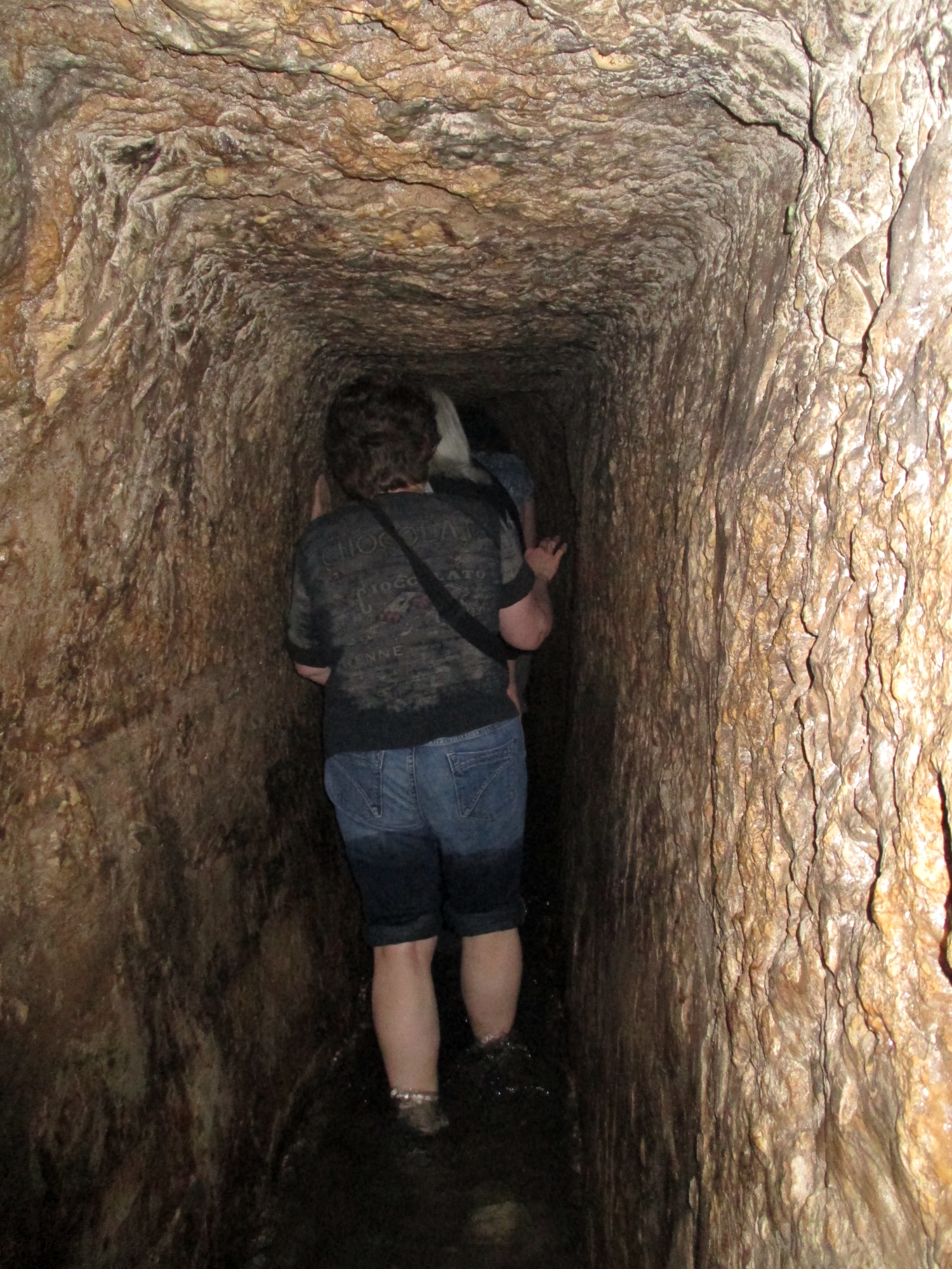 One of the few pictures I took inside the water tunnels underneath Jerusalem. At this moment the water level was relatively low (you can see the water marks on the woman in front of me to get a sense of how high it got), the ceiling is at about average height, and it's probably six inches or so wider than average.