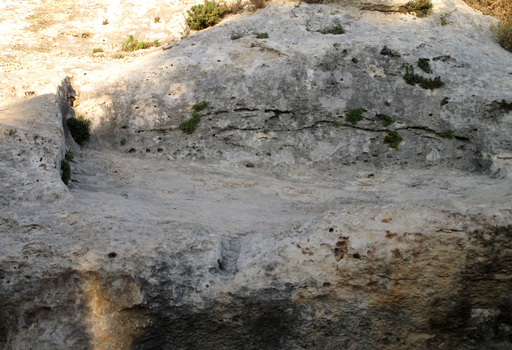 An ancient wine press. One or two people would stomp on the grapes in the flat area, and you can see the drainage canal where the juice would flow down, separated from the skins and seeds.
