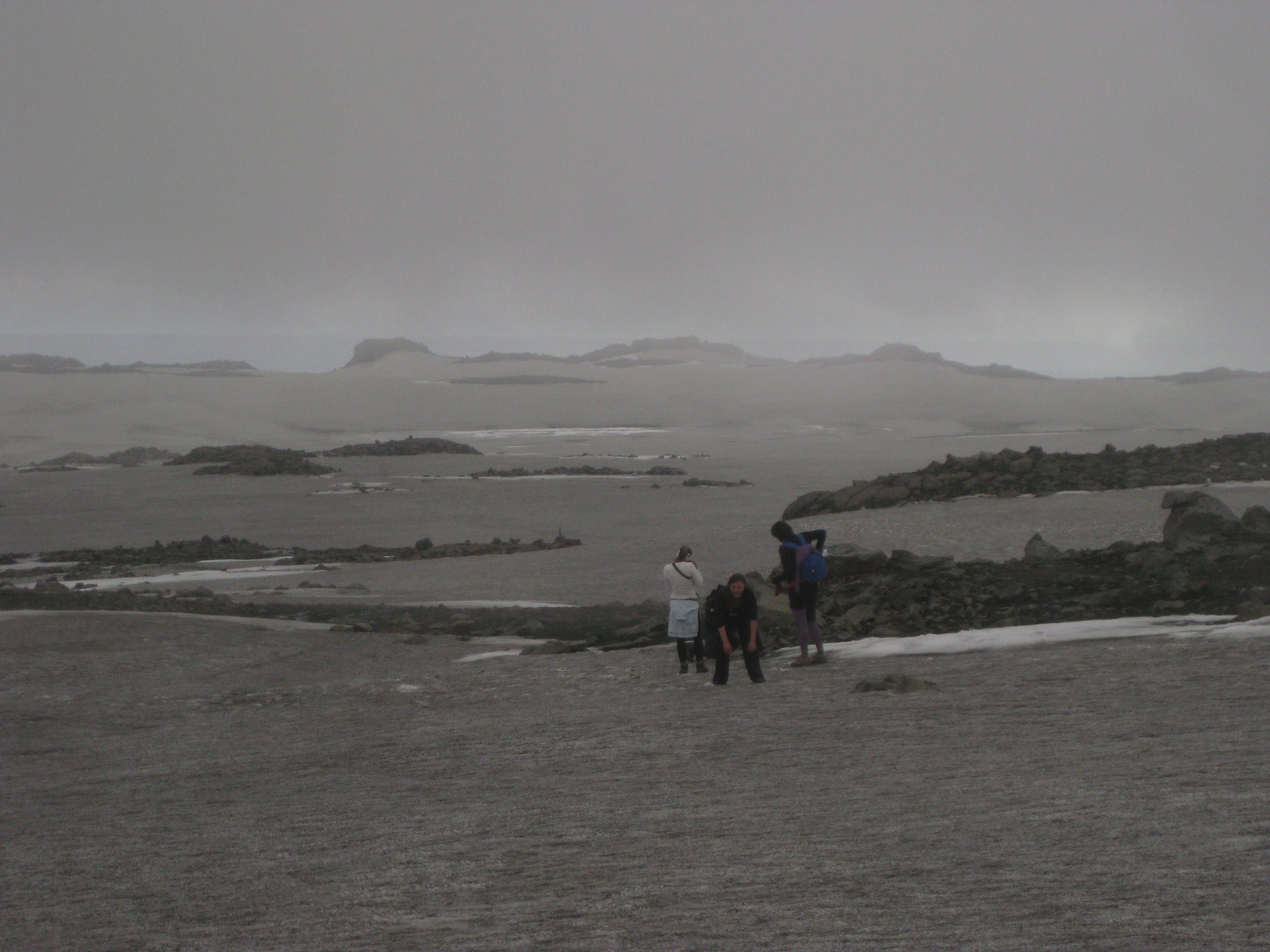 By staying on the trail of other footprints and keeping sight-lines between us, we eventually reach our rendezvous. Lunch is the sandwiches we prepared earlier that morning, which already feels like it happened some other day, to some other person. I change out my soaking socks for a fresh pair. At around four o'clock our professor/guide Orri finally arrives.