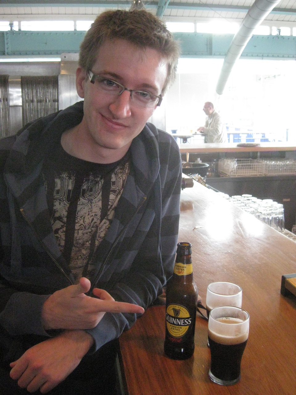 Sean and our free taste of Guinness “Foreign Extra Stout” which neither of us had ever had before, or even seen stateside.