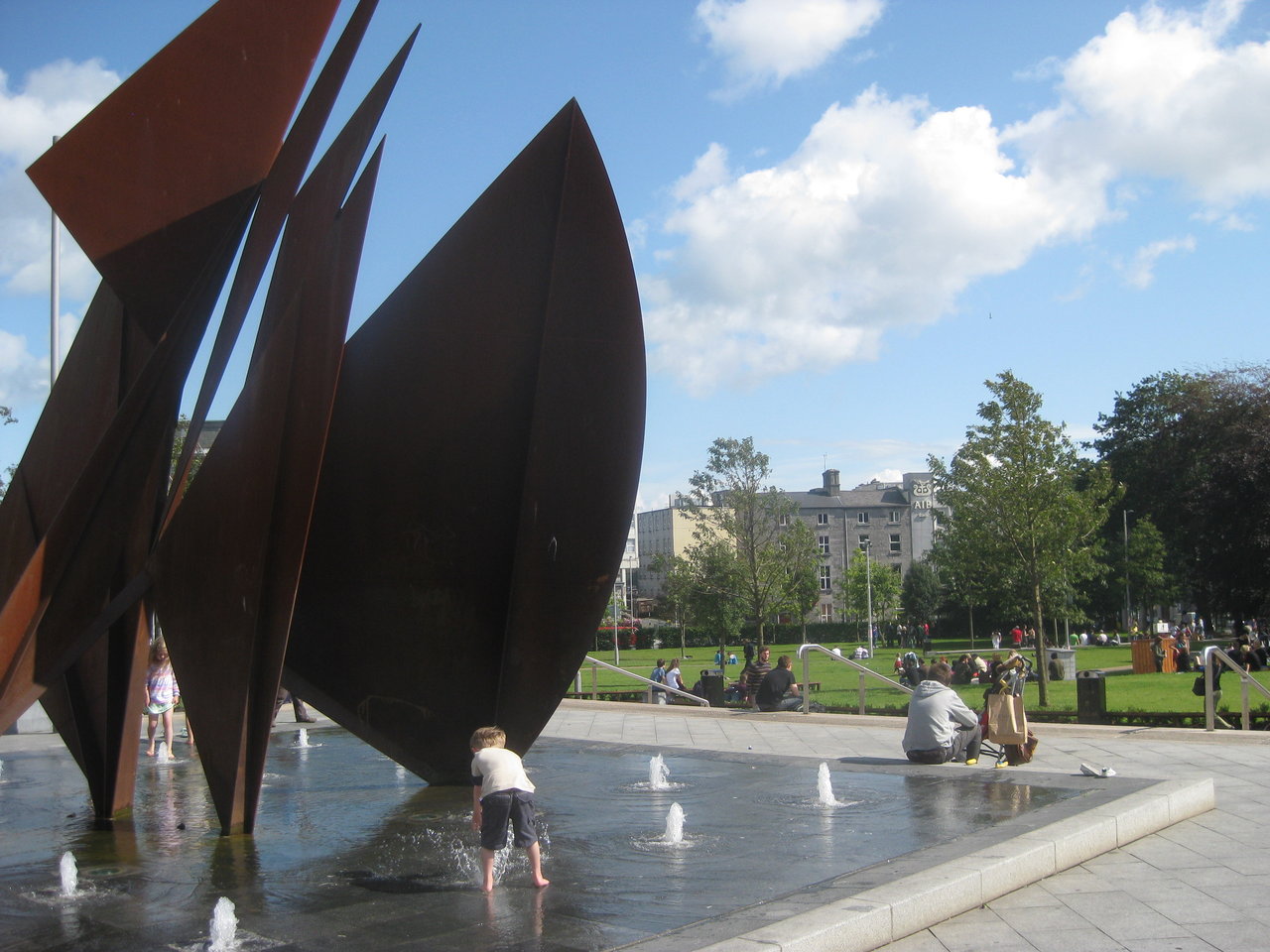 I consider this the quintessential Galway picture: there are little children splashing in a fountain while teenagers lounge on a lawn and fluffy white clouds tumble across the sky.