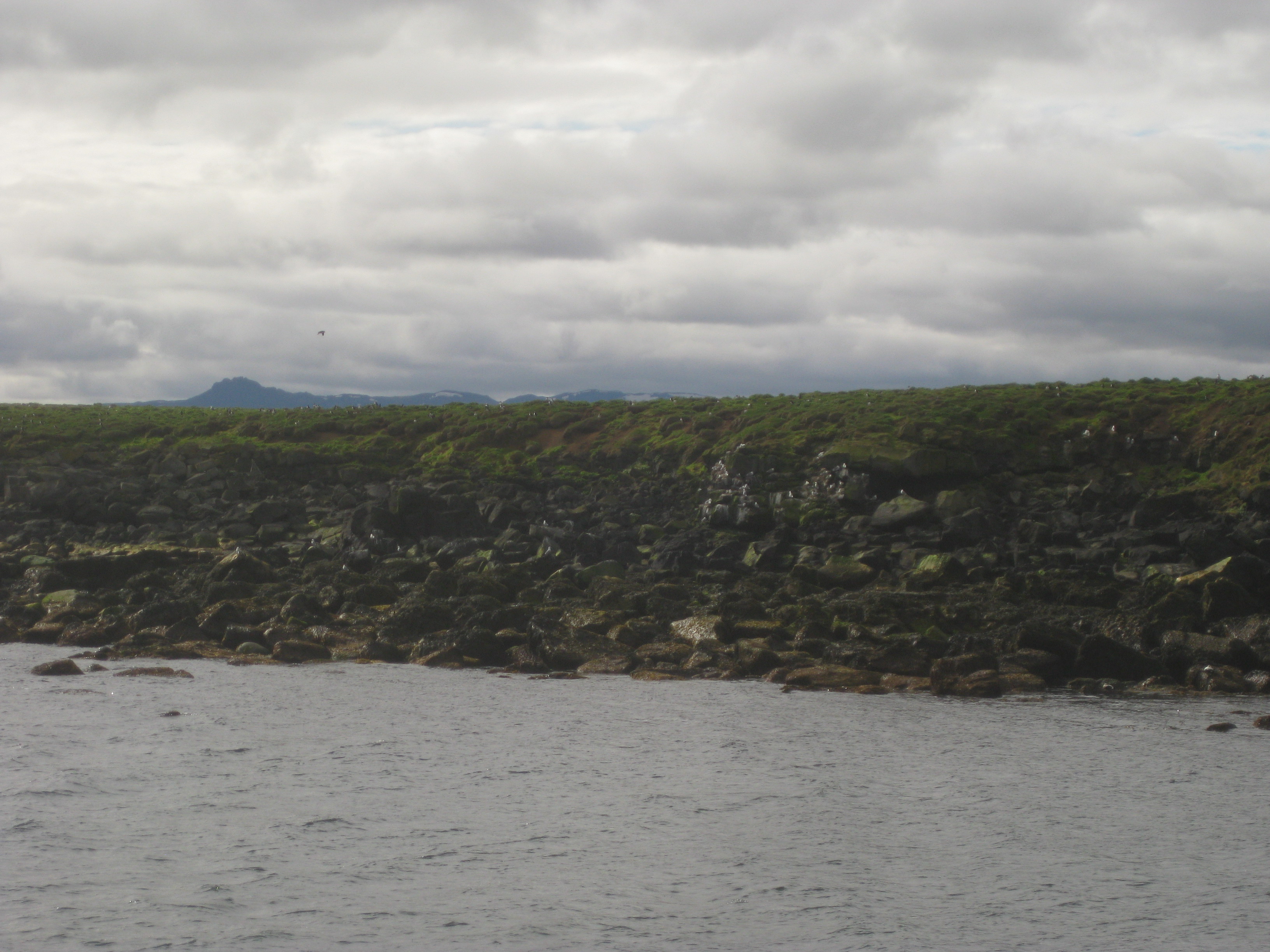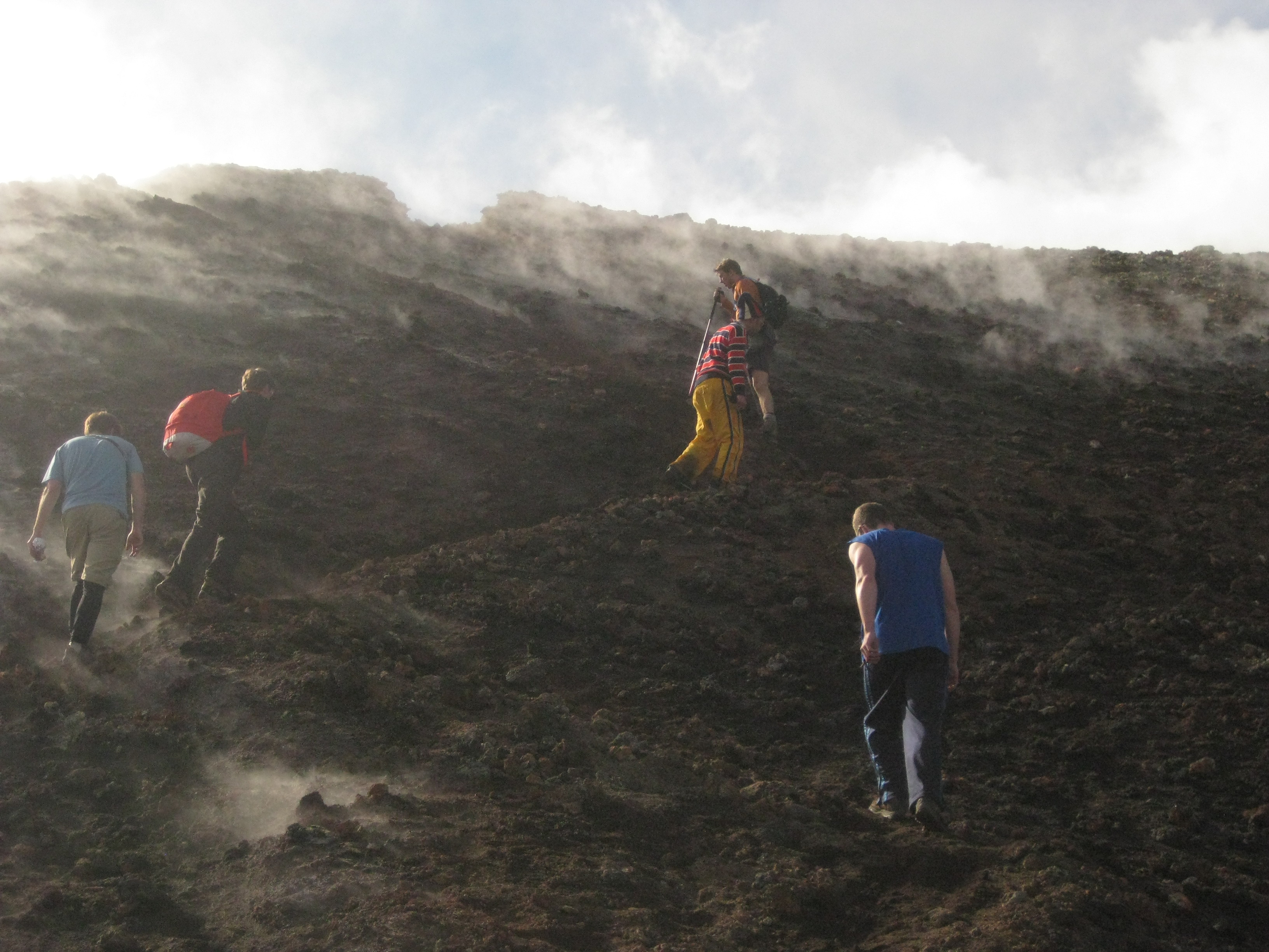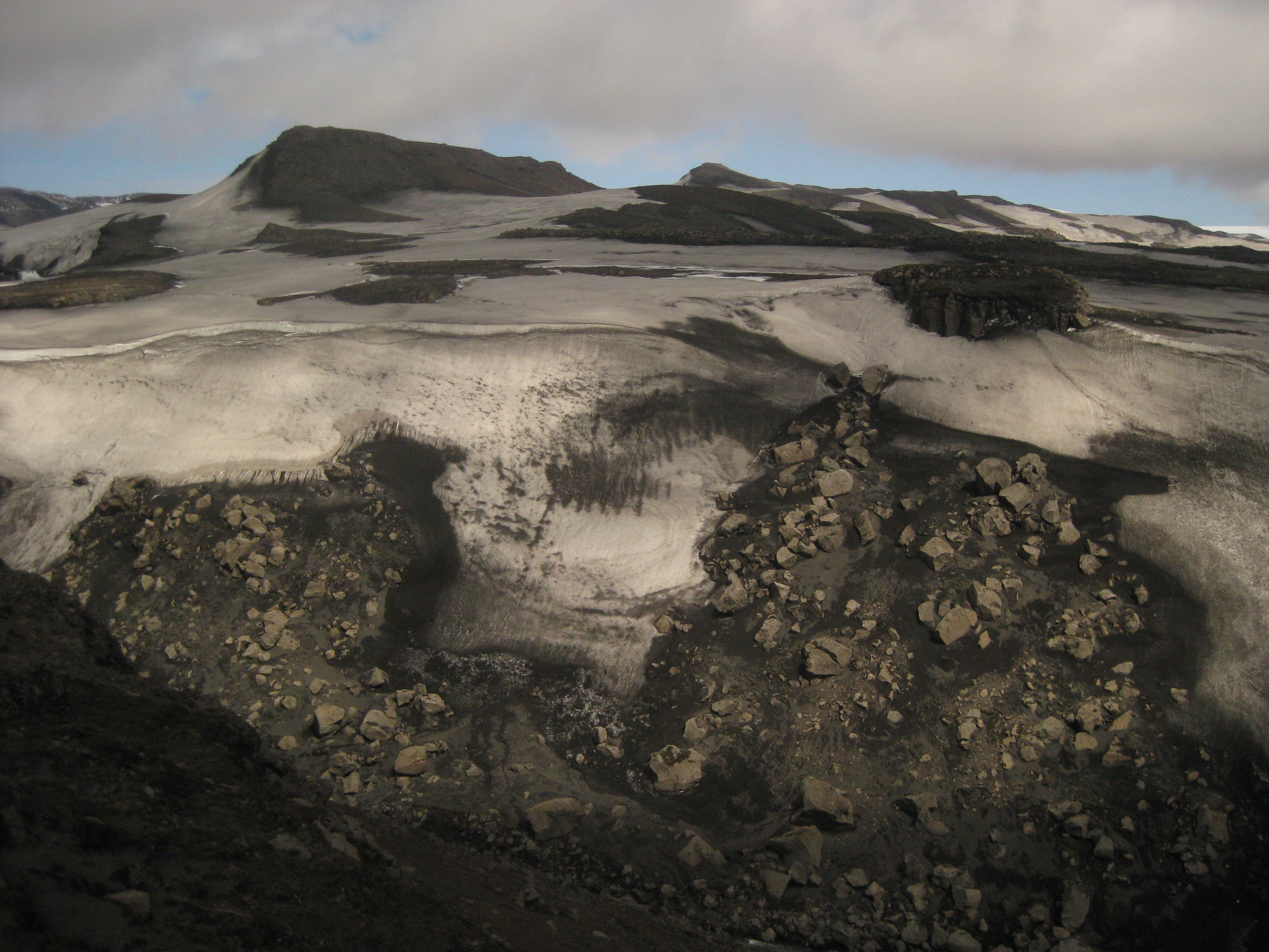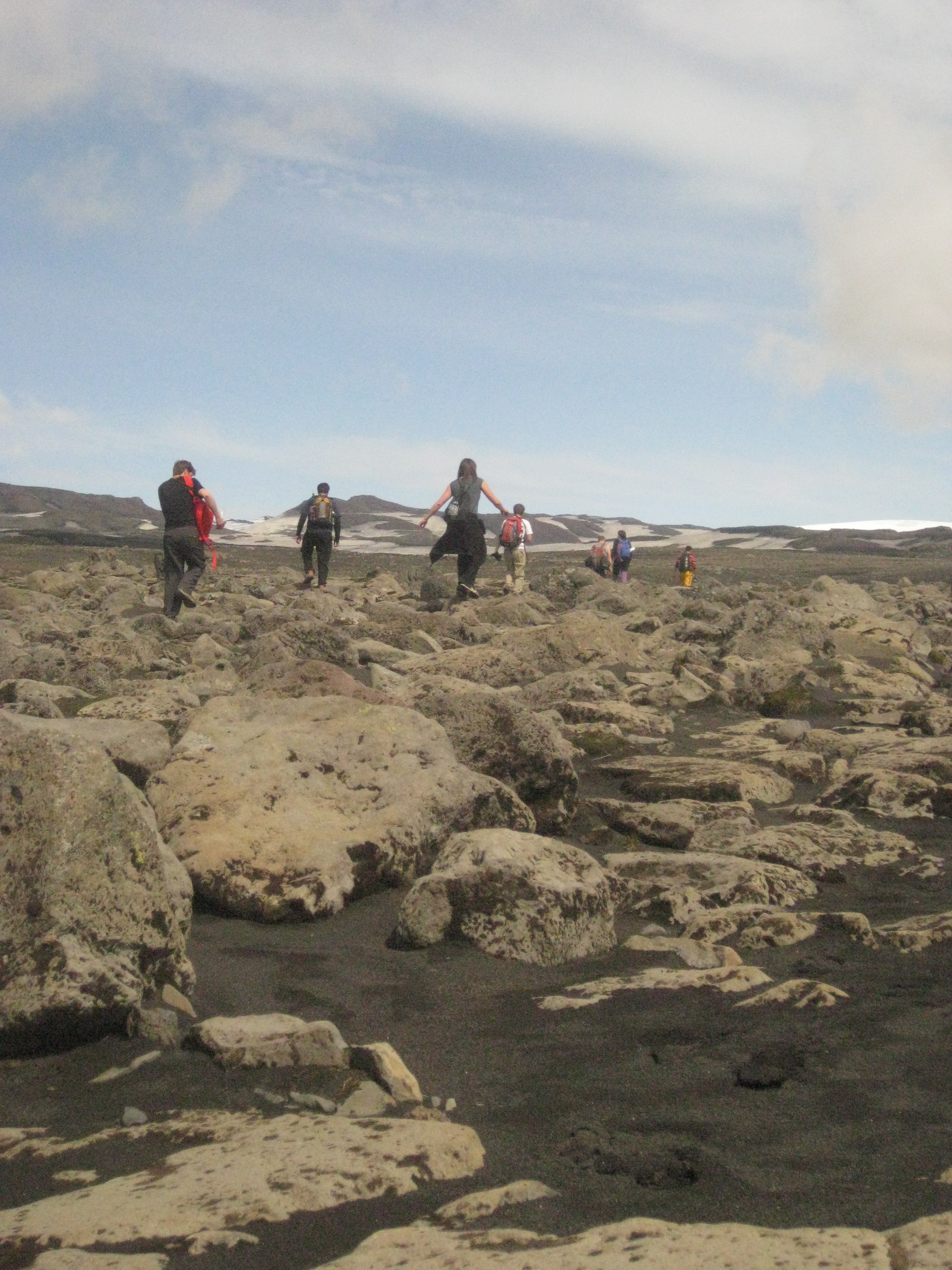 We circumnavigate the volcano and the steaming hot land of magma turns quickly into a frozen horizon of ice once again. I learn from the professor about the concept of "dead ice:" ice that during an eruption has such a thick layer of ash fall on it that when the lava comes it can't melt the ice below before it solidifies. This creates a layer of ice the effective ground level that will never melt, hence the "dead" part.