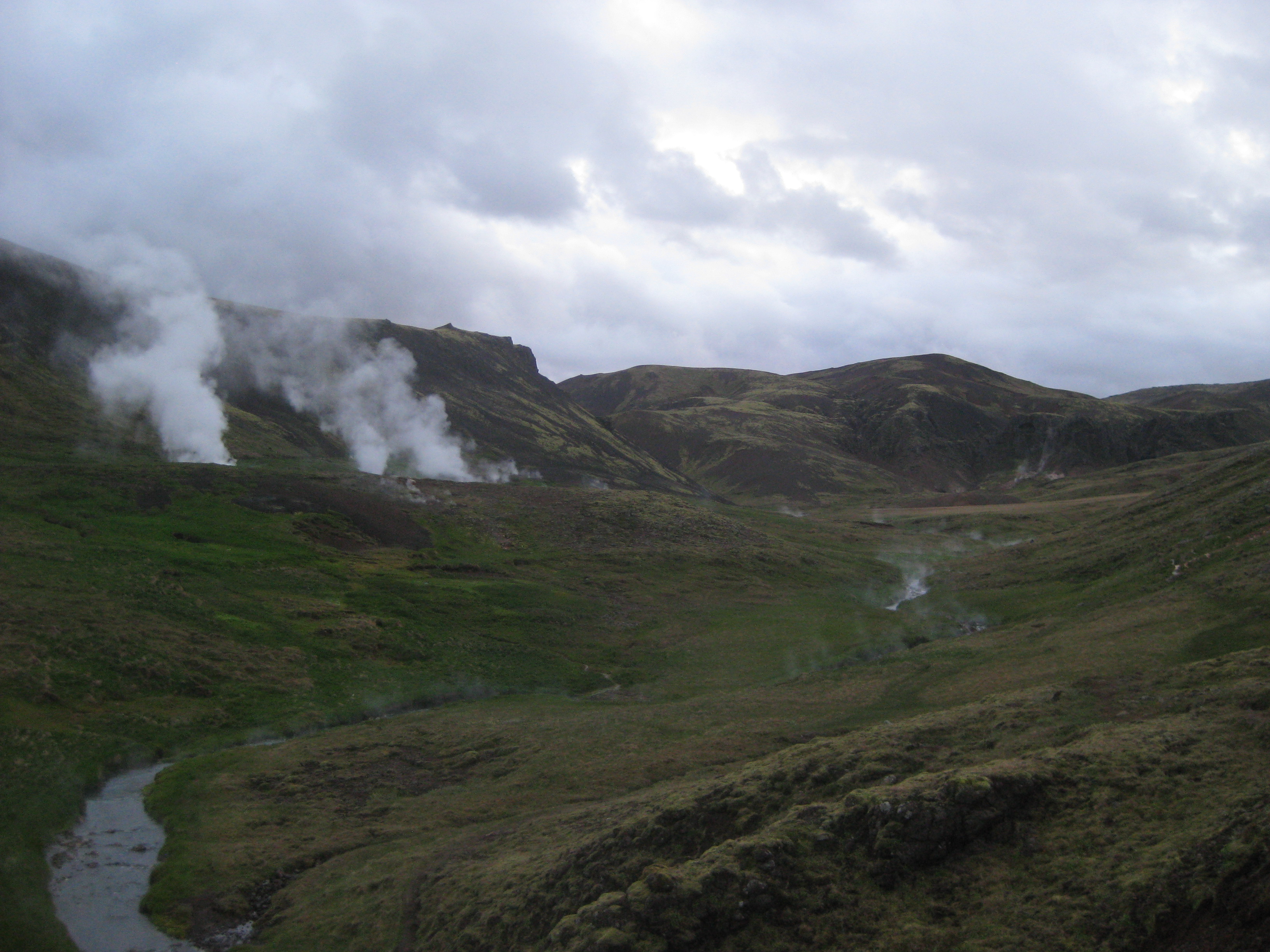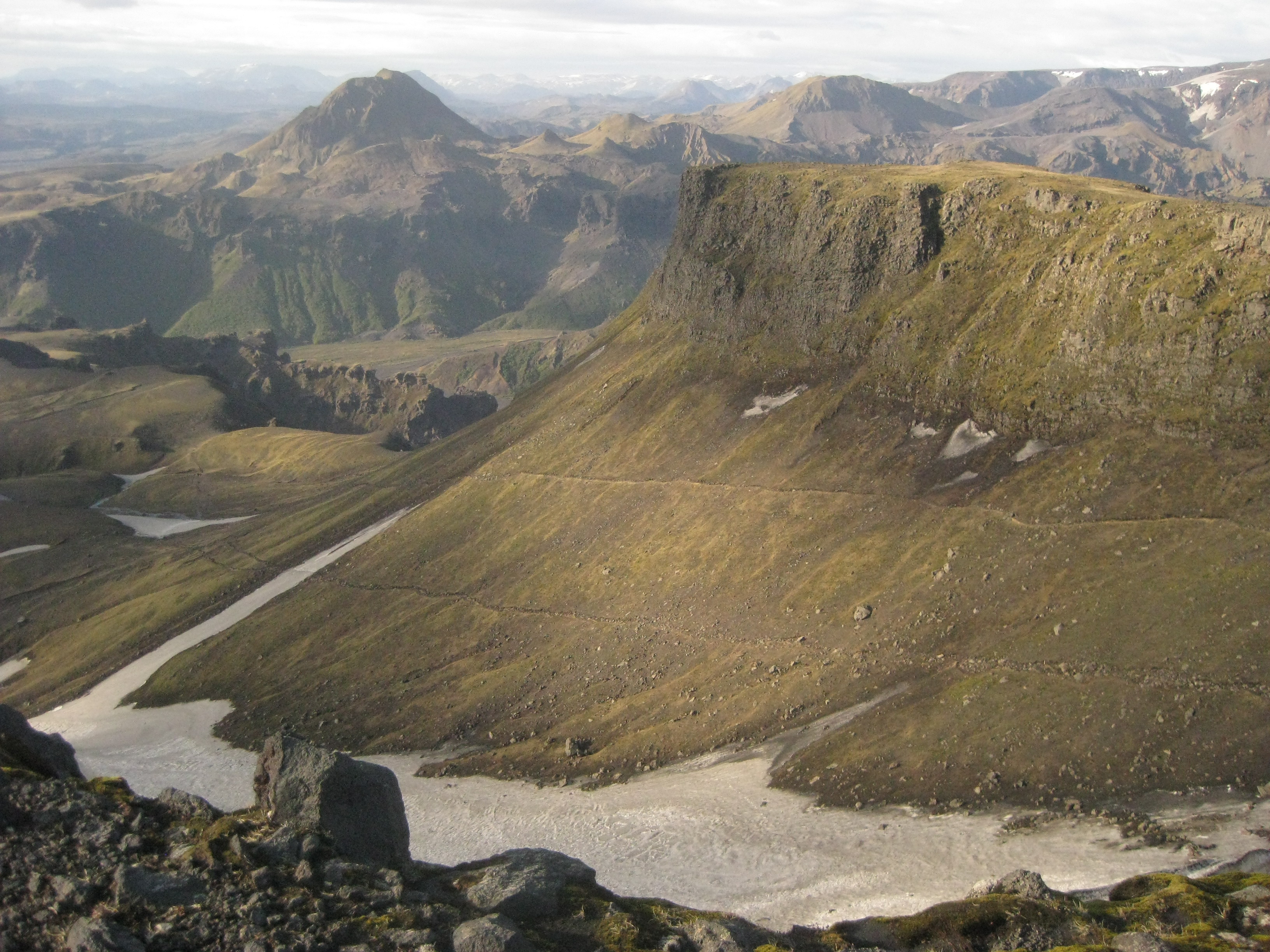 The descent ahead of us is a wide open vista of hills, mountains, ice caps, peaks, valleys and basins, eventually leading towards our camping grounds at Þórsmörk, which I am told actually translates to "Thor's Forest." Everything is just so huge here that the sense of vertigo is overwhelming at times. I slowly begin to understand the concept of agoraphobia.