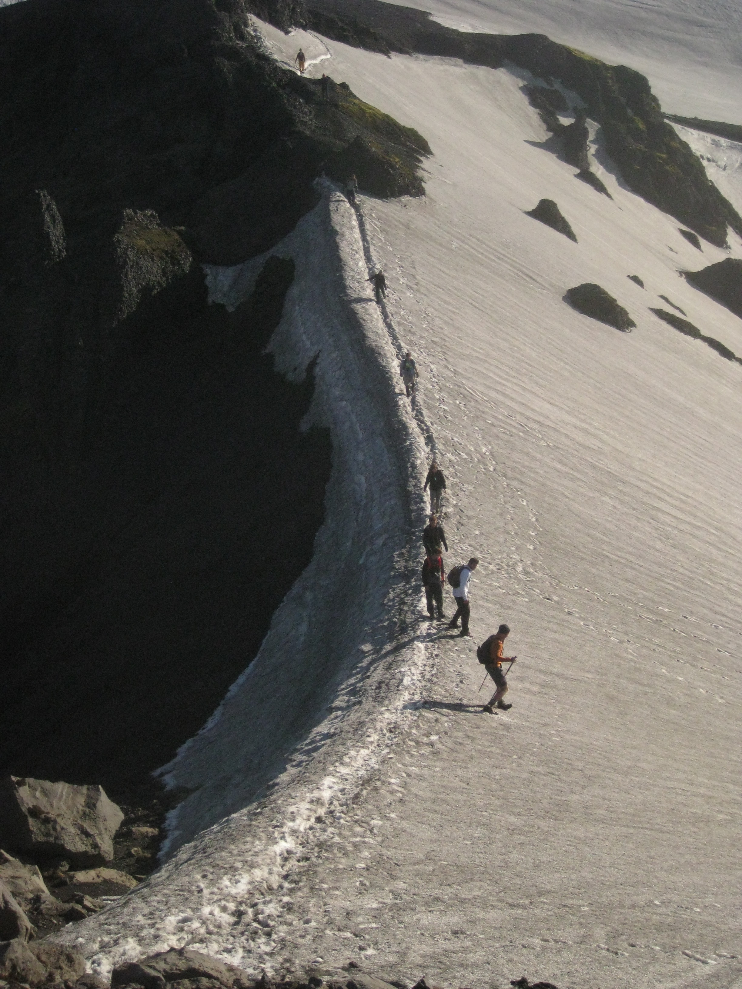 A perilous ledge made of only ice that we had to cross to continue the trail down.