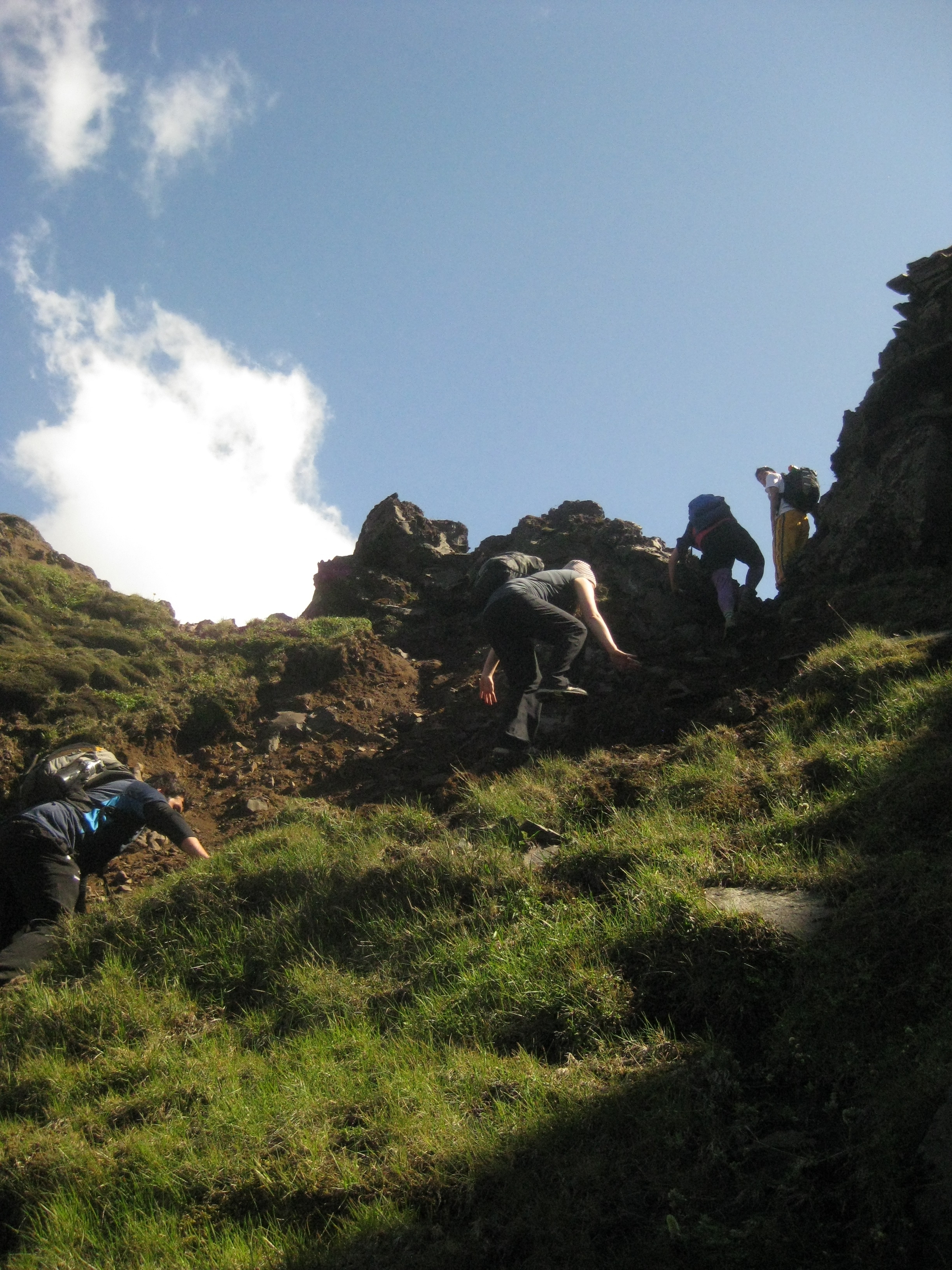 The vast majority of our trip down was spent on the next leg: a dusty trail cut into the mountainside called the "Cat's Back." The name is very literal, and meant to conjure the image of a person trying to successfully balance across the spine of a feline. It is an apt name. At one point the gravel of the path slips beneath my feet and I slide for a couple inches along the ledge. Nothing gets your adrenaline pumping as much as harrowing moments like that.